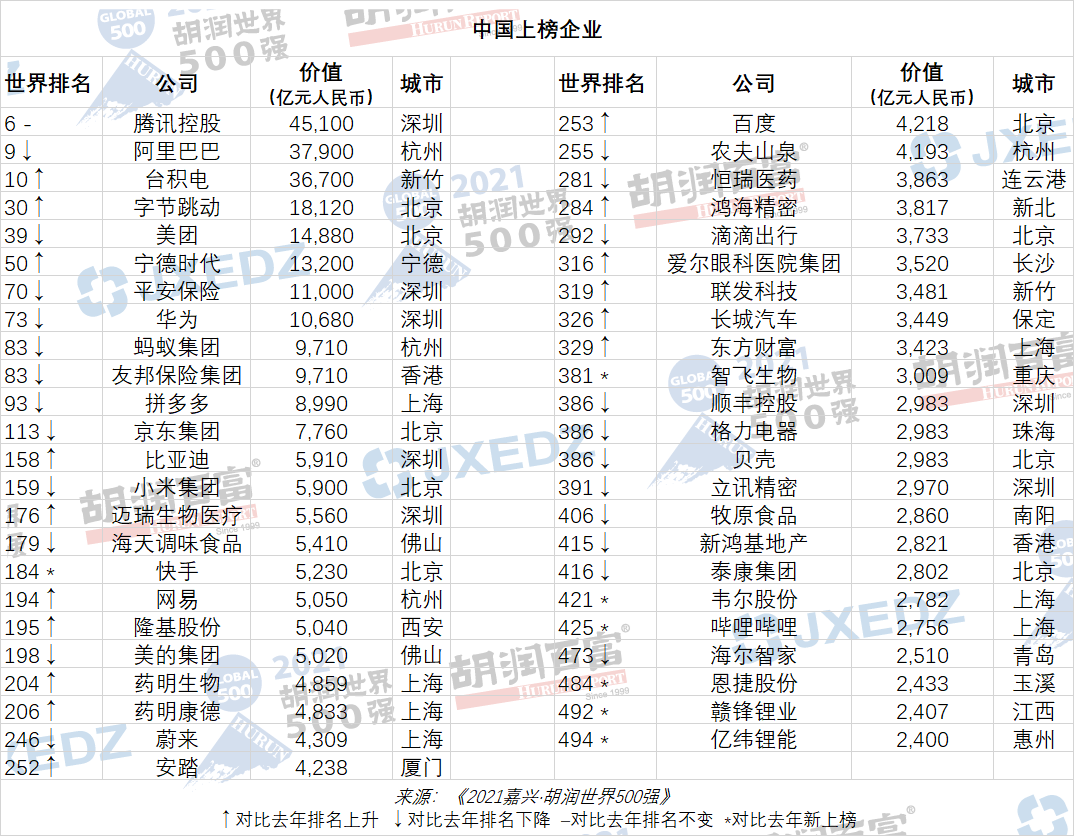 胡潤世界500強榜單:騰訊阿裡(lǐ)領銜中國(guó)企業,華爲小米上榜 發布時間:2021-09-06 23:26